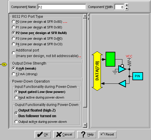 The remainder of this article provides background information on why these types of designs require special attention and potential solutions. Connecting P2 to External LogicThe 8051 microcontroller within an E5 device is completely embedded, without any dedicated PIO ports. A soft module available in the FastChip Development System is required to connect any of the 8051’s PIO ports to external device pins. The “8032 PIO Port” soft module creates a PIO port that is exactly compatible with that found in the original 8051 device. However, this port is built using resources within the E5’s Configurable System Logic (CSL) matrix. Figure 1 shows the FastChip graphical interface when the soft module is configured as PIO port P2. The register controlling the P2 PIO port is the 8051’s P2 Special Function Register (SFR), one of the 8051’s private registers. Figure 1. The "8032 PIO Port" soft module provides a PIO port nearly exactly compatible with those found on the original 8051. However, there subtle nuances if using the P2 option and indirect addressing to XDATA space. Because there are not any dedicated PIO ports on the E5, the P2 port is built in the E5’s CSL matrix. The CSL-based function must have access to the contents of the 8051’s private P2 SFR register. The E5 hardware allows this because the embedded 8051’s SFRs can be exported. When an SFR register is exported, the address and data for the SFR register is visible to the CSL matrix via the Configurable System Interconnect (CSI) bus socket. If a design uses the “8032 PIO Port” soft module to connect the P2 PIO port to external logic, FastChip automatically exports the P2 SFR and builds the appropriate logic to model the port. If P2 PIO port does not connect to external logic, then the SFR is not exported to the CSL and it behaves just like it would on the original 8051 device. Accessing Data in XDATAThe 8051 microcontroller has up to 64K-bytes of external data address space, called XDATA. The 8051 provides multiple methods to access XDATA, including both direct and indirect addressing modes. Direct External AddressingThe most common method to access XDATA in an 8051 is using direct addressing. The 64K-byte XDATA region requires 16 address bits to uniquely decode a byte location. As shown in Figure 2, the 8051’s 16-bit pointer to external data is called DPTR. On the E5, there are actually two such data pointers. The second 16-bit data pointer is called DPTR1, defined by the two byte-wide SFR registers DP12 and DPL1. The DPS SFR register selects between the two data pointers.