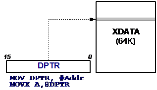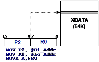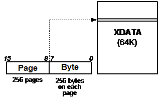 Figure 2. Using direct addressing, the 16-bit DPTR data pointer points to a location in XDATA space. To read a value from XDATA, the application program first loads the data pointer with the address of the data value. Then, the program uses the move external instruction (MOVX) to move the data, pointed to by DPTR, into the accumulator or vice versa. Indirect AddressingThe 8051 microcontroller also provides an indirect addressing mode, typically used to access one of the 256 RAM locations available within the 8051 microcontroller. Some compilers call this region IDATA for indirectly addressed data. Indirect addressing uses either register R0 or R1 within the 8051 as an 8-bit address pointer. For example, to read a value from internal RAM, the address for the RAM location is loaded into either register R0 or R1. In this example, R0 is loaded with the 8-bit RAM address. A variant of the move instruction uses R0 as a pointer to RAM and loads the value at the specified location into the accumulator. MOV R0, #ADDR8 MOV A, @R0 Indirect External AddressingAs described above, directly addressing XDATA address space requires a 16-bit data pointer. However, the code density of an application is improved by breaking the 64K-byte region into 256 pages of 256 bytes each. That way, the address for a particular XDATA location consists of a byte-wide page address and a byte-wide address within a page, as shown in Figure 3.