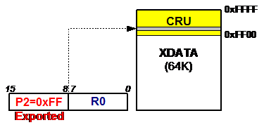 Figure 4. Indirect addressing to XDATA on the 8051 uses the P2 SFR register as the page address and either R0 or R1 as the address within the page. To access a specific byte within XDATA, the application program must load the P2 SFR register with the upper 8 bits of the 16-bit XDATA address. Then, the application program loads either R0 or R1 with the lower 8 bits of the 16-bit XDATA address. To read or write the location, the application program then uses a variant of the move external instruction (MOVX) that uses register R0 or R1 as the address pointer within the current 256-byte page, pointed to by P2. Figure 4 uses R0 but R1 would be similar. Code density is improved using this technique because most data accesses are localized. Consequently, only an 8-bit pointer is used to address data for most accesses. The page pointer, P2, is modified more rarely. Indirectly external addressing on the E5 works exactly the same way as on the original 8051, given that the P2 PIO does not connect externally. In other words, the E5 correctly handles indirect external addressing if the P2 SFR register is not exported. Using Indirect External Addressing from a ‘C’ CompilerMost 8051 ‘C’ compilers do not use indirect external addressing unless specifically instructed to do so. For example, using the Keil ‘C’ compiler, variables must either be specifically declared as paged data (PDATA) or the compiler must be specifically instructed to use the compact memory model. Additionally, the P2 SFR register must be initialized with proper page address using the STARTUP.A51 startup program. Similarly, the starting address for PDATA must be specified for the linker. The Problem: Indirect External Addressing and Externally Connecting P2There is a specific problem in E5 applications that externally connect P2 as an 8051 PIO port and use indirect external addressing. Because the P2 SFR register is exported in these cases, any indirect external addressing operations do not perform as expected. If P2 is exported, as shown in Figure 5, then the upper 8 bits of an indirect external address operation will always be 0xFF, regardless of the value loaded into P2. If P2 is exported, then indirect external addressing is limited to a single 256-byte page at the top of XDATA space.