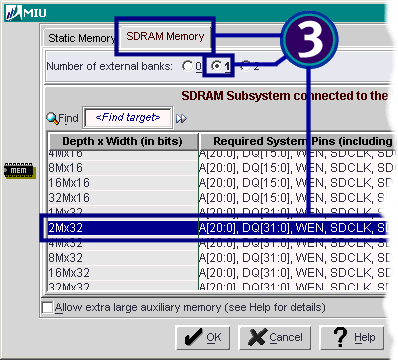 Click the SDRAM Memory tab. Choose 1 external SDRAM bank. Select a 2Mx32 SDRAM memory subsystem. The Micron 64Mbit, x32 device is effectively an entire 2Mx32 memory subsystem, implemented in a single SDRAM component. Click OK.