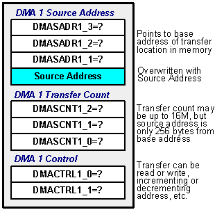 Setting Up DMA Channel 1The settings in DMA channel 1 define where the CSL data is stored in physical memory, as shown in Figure 3. Figure 3. Settings for DMA Channel 1. In this simple example, the source address pointer for DMA 1 points to a 256-byte region someplace in the E5’s 32-bit physical memory. Only the upper 24 bytes matter. The lowest byte is the Source Address, specified in the CSL matrix and copied into DMA 1 by DMA 0. The remaining fields vary depending on the specific application. The transfer count can essentially be any value, up to 16Mbytes. However, in this simple example, the start address is limited to a 256-byte region. DMA 1 can perform CSL-to-memory or memory-to-CSL transfers using any of the DMA’s automatic addressing modes. The only required transfer parameters are that the DMA channel be enabled, initialized, and set to continuous initialization. Turbo Charging the SolutionIn the simple design described above, the CSL-based function was restricted to random locations in a 256-byte region. This restriction minimizes the CSL resources to implement the design. Another restriction is that most of DMA 1’s transfer parameters are pre-configured by the CPU and cannot be modified by the CSL-based function. The following extension to the scheme not only allows the CSL-based function to address any location in 32-bit physical memory, but also allows the CSL-based function to control the transfer parameters in DMA 1. By replacing the simple 8-bit Source Address register shown in Figure 1 with a small 16-deep by 8-bit-wide dual-port RAM, the CSL-based function has full control of DMA 1’s transfer parameters. So instead of a single type of read or write operation to a 256-byte region of memory, this technique allows the CSL—without CPU intervention—to …