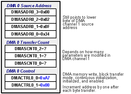 The DMA 0 transfer parameters remain essentially the same with few modifications, as shown in Figure 4. The transfer count must be adjusted depending on how many parameters need be modified in channel 1. Changing the entire 32-bit source address requires just a four-byte transfer. Changing all parameters requires a nine-byte transfer. Figure 4. DMA Channel 0 Settings When Using Dual-Port RAM. DMA 0 must be configured for block request mode, where a single request causes the DMA to transfer the number of bytes indicated in the transfer count register. Each byte transfer generates an individual acknowledge signal. The automatic addressing mode should be set to increment the address after each transfer. The additional CSL resources are minimal—8 additional CSL cells for the dual-port RAM plus another 8 cells for various tracking coutners—but there is additional transfer latency due to the larger number of parameters written to DMA 1. One slight modification, beyond using dual-port RAM, is that the DMA 1 request should not be issued until after the last DMA 0 transfer is acknowledged. Tracking the number of acknowledge signals requires a small binary counter in the CSL matrix.